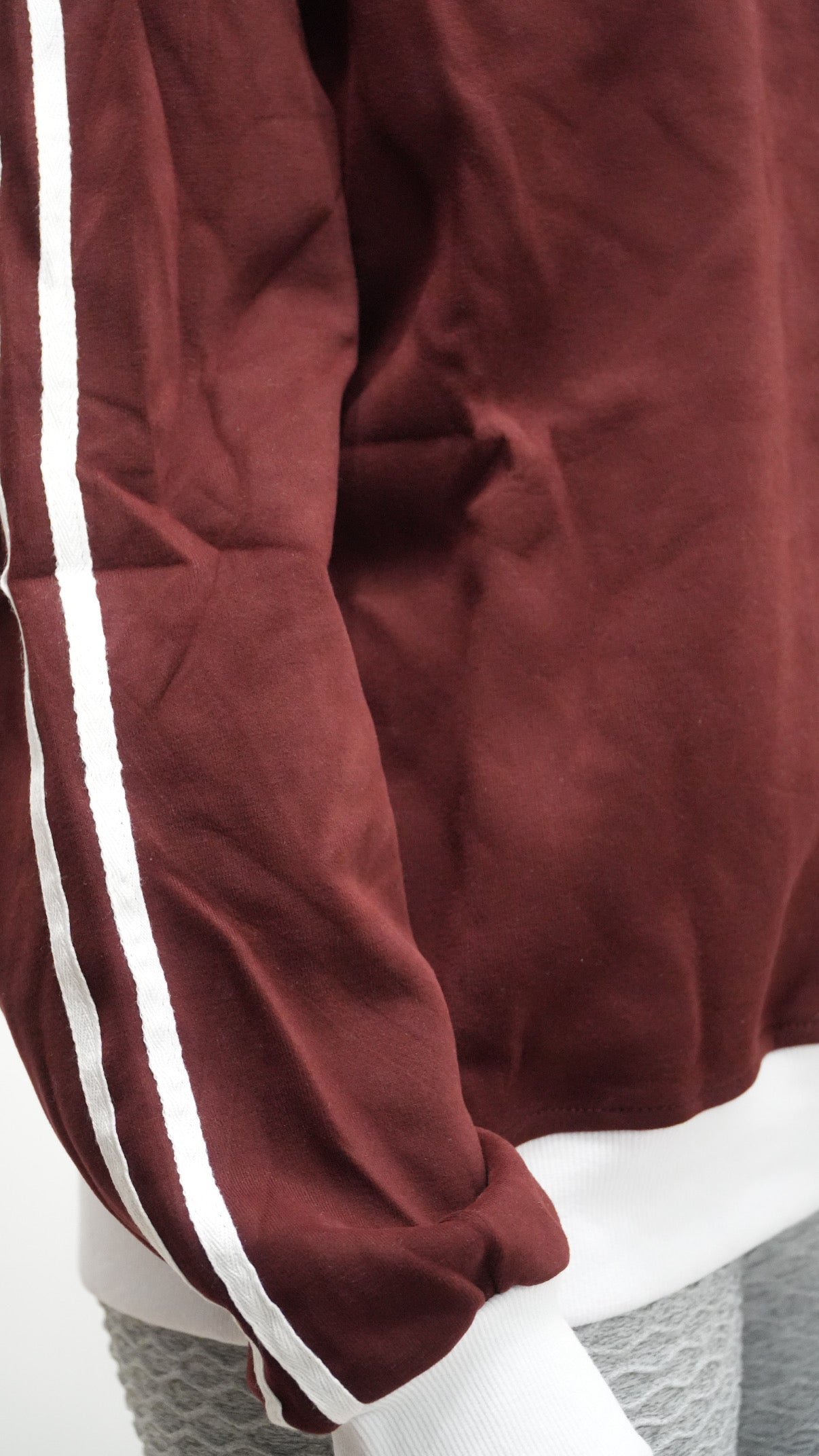 Sweater de gola V com zíper detalhes de listra na manga, punho e barra com tecido canelado.